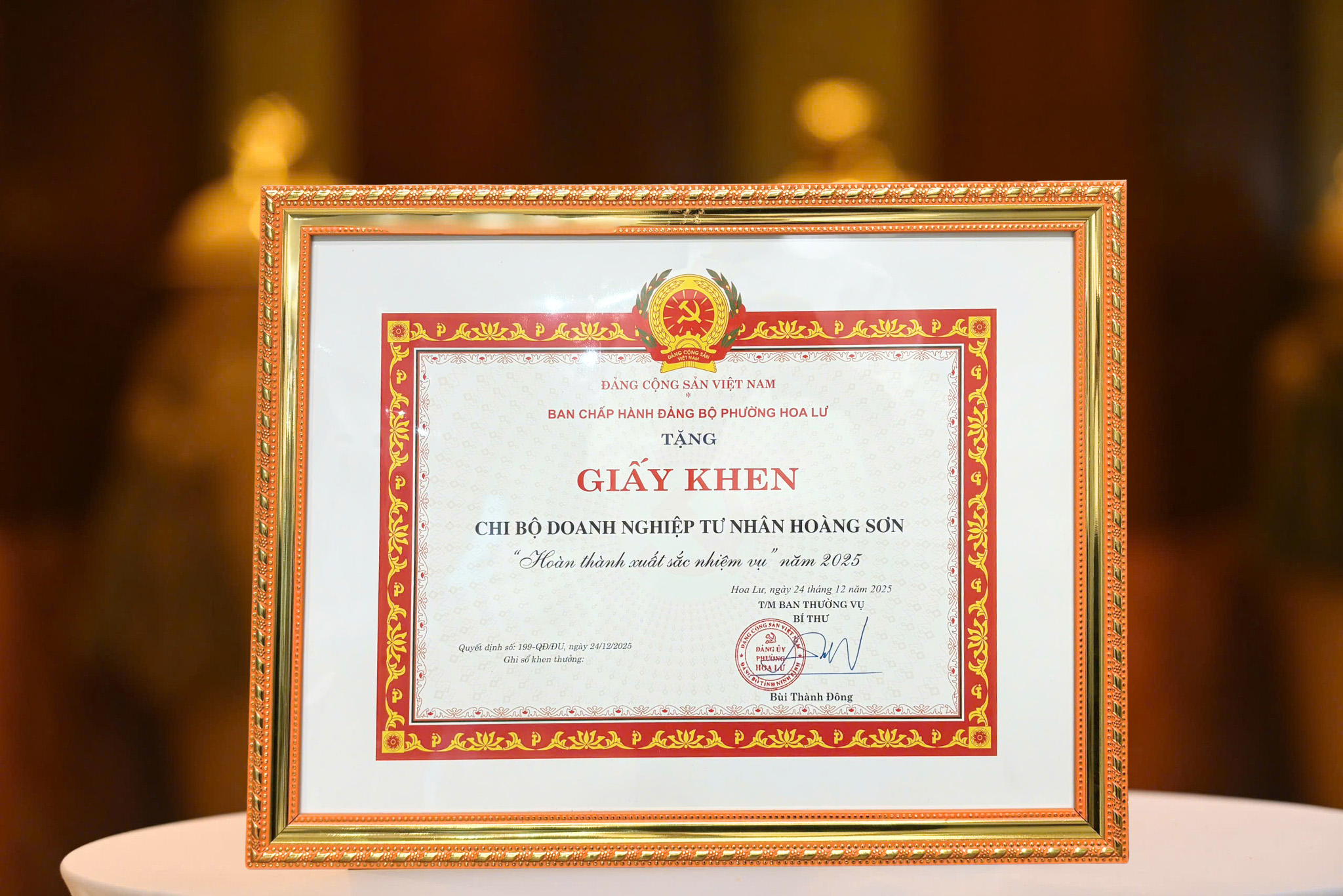 Nhân dịp này, Ban Thường vụ Đảng ủy phường đã khen thưởng các đảng bộ, chi bộ hoàn thành xuất sắc nhiệm vụ năm 2025 - Chi bộ DNTN Hoàng Sơn cũng vinh dự được biểu dương và khen tặng“ Chi bộ hoàn thành xuất sắc nhiệm vụ năm 2025”.Chi bộ đã cùng Ban giám đốc doanh nghiệp chỉ đạo hoàn thành chỉ tiêu kế hoạch trong hoạt động sản xuất kinh doanh và đóng góp công sức trong việc xây dựng đô thị Hoa Lư theo hướng "Xanh - Sạch - Đẹp - Văn minh - Hiện đại".